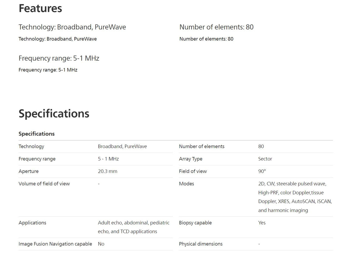 - Applications: Adult/Pediatric, Cardiac, Abdominal, Echo, TCD